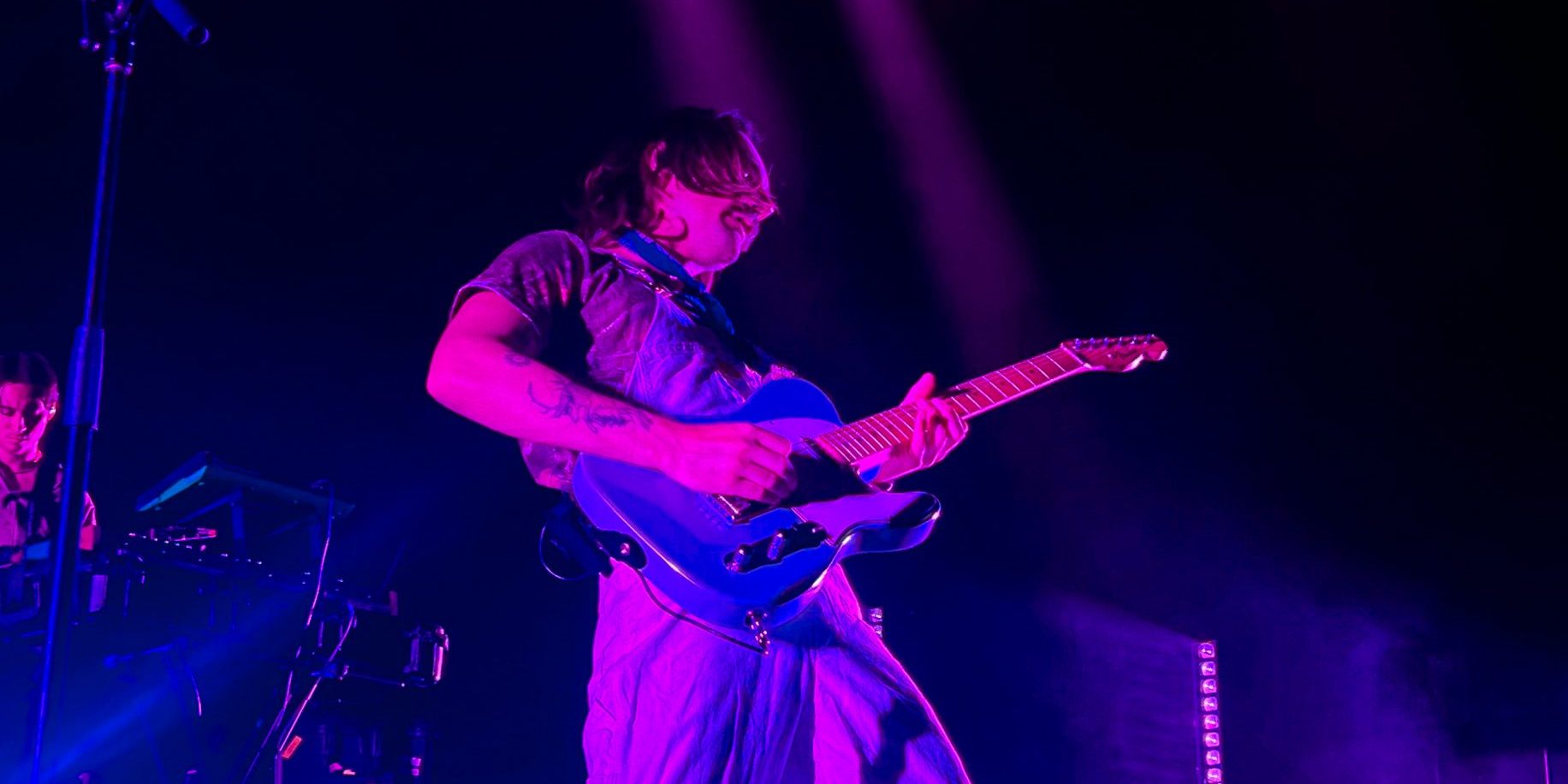 Blanketing the crowd with a sound reminiscent of Glass Animals and Alt-J, slenderbodies walks a fine line between electronic indie and R&B. Performing songs like “anemone” and “gray,” the duo tiptoes between a hushed storytelling afforded by falsetto vocals and a distinct sound characterized by plucky guitar.