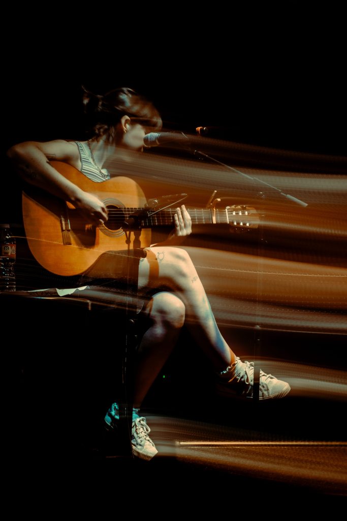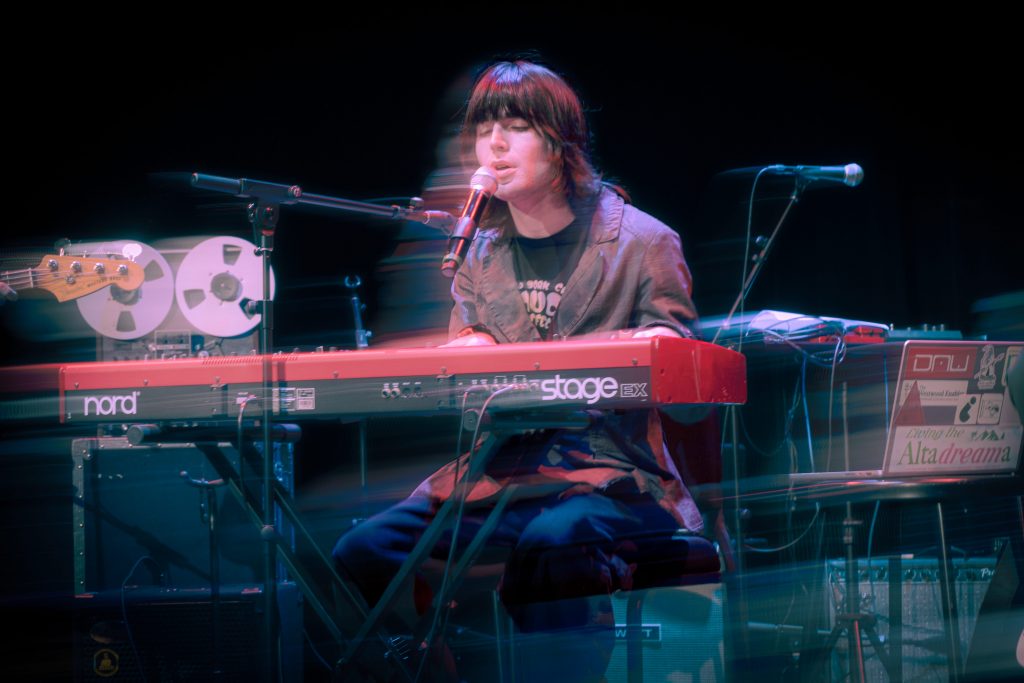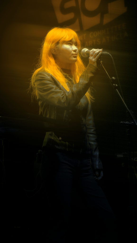 Among the opening performers was student artist Jules Francis, who, with guitar players Connor Gilbert and Henry Baskin, brought a sound reminiscent of Tatsuro Yamashita and a late 70s Joni-esque synth folk style. It was all smiles on stage and in the pit, and it was heartfelt to see the group of dedicated friends and fans peacefully swaying together. On next was Chloe Moser, delivering sweet acoustic folk songs that worked to capture the young sapphic zeitgeist. Lyrics focused on yearning and lost loves, and Moser brought an easy-going personality that lightened the mood, which was almost immediately crushed as Locust took the stage.