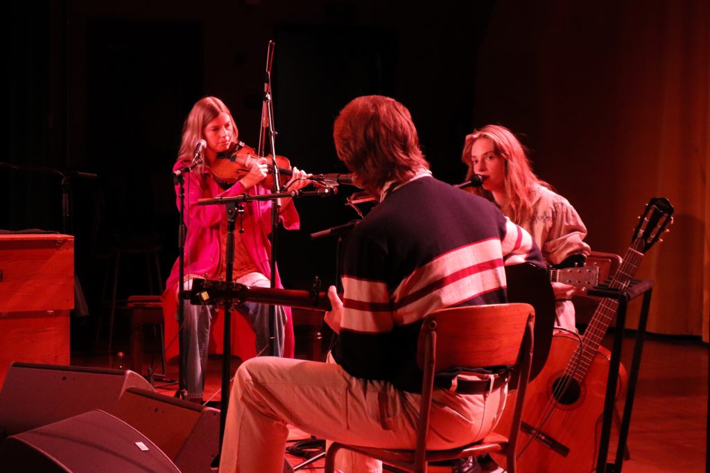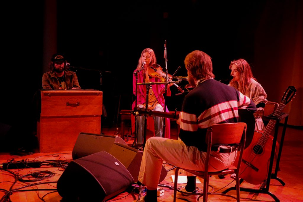 The show began promptly at eight, and it quickly became clear that the night would serve as a preview of MAITREYA CORSO, Hawke’s upcoming album set to release on May 1st. The project is a full-length collaboration between Hawke and her husband, Christian Lee Hutson. Throughout the night, she performed alongside a tight-knit group of musicians who brought the new material to life, including Hutson, violinist Odessa Jorgensen, and producer Benjamin Lazar Davis.